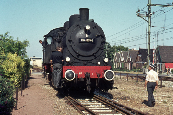 Dieren, zomer 1975. Loc 094 055, de eerste locomotief van de VSM, vandaar het nummer 1 op de bufferbalk. De loc heeft alleen in 1975, het eerste rijseizoen van de VSM, dienst kunnen doen. Begin 1976 werd ze door het Stoomwezen afgekeurd. De VSM had geld nodig en verkocht de loc aan een sloper in Apeldoorn. Die wilde de loc als blikvanger gebruiken, maar later werd ze toch gesloopt. Als ik goed ben geinformeerd heeft de VSM nog wel pogingen gedaan de loc terug te kopen. In het rijseizoen 1976 kwamen locs 023 076 (VSM 2) en een door Krupp gebouwde loc (VSM 3) in actie. Loc 3 ging in 1981 naar de SSTT maar raakte door een roekeloze NS-machinist tijdens het transport zwaar beschadigd; ze heeft daarna nog jaren bij het Autotron in Rosmalen gestaan. Foto Jan Blijerveld. |