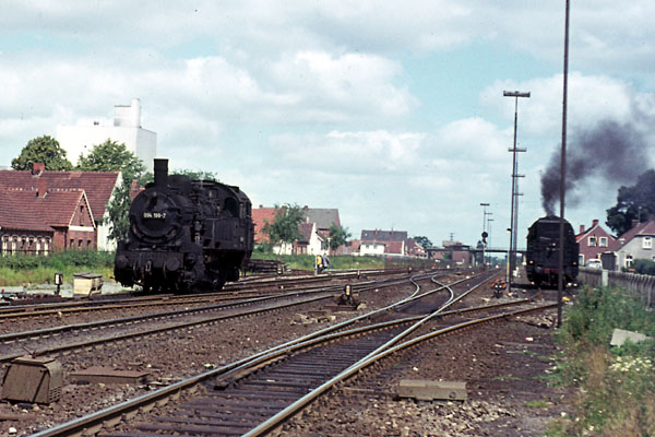 Leer, 13 juli 1971. Loc 094 199 rijdt voorbij. Rechts staat 023 094 te wachten op haar volgende rit. |