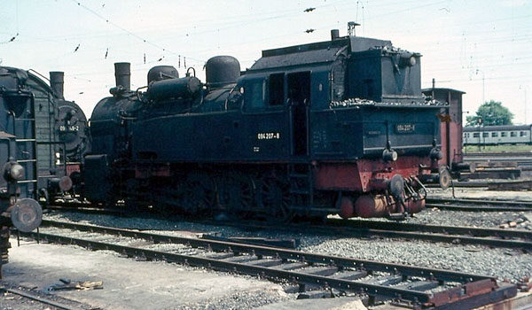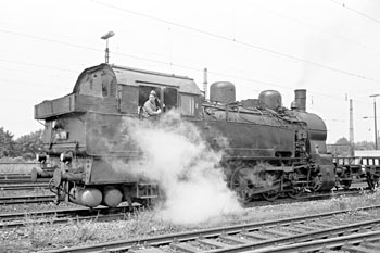 Bw Emden, 17 augustus 1974. Een afgevoerde loc Baureihe 94. De nummerplaten zijn verdwenen. Een van de afgevoerde locs die in Emden stonden, is in 1977 naar Gennep gehaald en daar als monument opgesteld. |