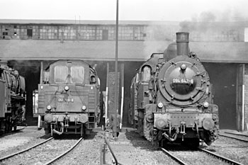 AW Lingen, 21 augustus 1970. Loc 094 597 is gereviseerd en wordt nu stoom gebracht. Het opschrift "Abbauen" op loc 094 584 geeft daarentegen weinig hoop op de toekomst. Klik hier voor meer foto's in AW Lingen. |