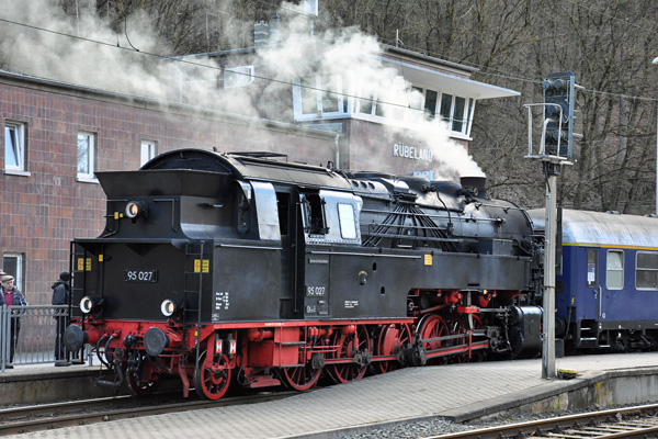 Rübeland, 27 februari 2017. Tijdens een zesdaagse stoomrondreis vanuit Nürnberg, georganiseerd door IGE Eisenbahn Erlebnisreisen, kwam onder andere loc 95 027 in actie. Foto Paul Boersma. |