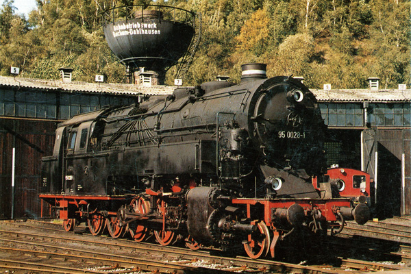 Baureihe 95 (T20)De vijfassige locs van de serie T20 waren de zwaarste goederentreinlocs die voor de Pruisische spoorwegen zijn gebouwd. Tussen 1922 en 1924 leverde Borsig 45 locomotieven, die vooral op steile hellingen tot hun recht kwamen. Ze waren voorzien van Riggenbach-Gegendruckbremse: remmen door middel van tegendruk in de stoomcilinders. In Oost-Duitsland zijn de meeste locs later omgebouwd op oliestook. Van deze "Bergkönigin" zijn de 95 009, 95 016, 95 020 (als 95 007), 95 027 en 95 028 bewaard gebleven. |