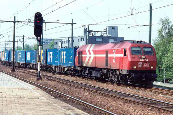 Tilburg, 2000. HGK-loc 13 is op weg van de Maasvlakte naar Venlo. De machinist is Johan Nieuwenhuis, de foto is gemaakt door Erwin Nieuwenhuis. HGK heeft drie locs van het type MaK DE 1024 (bouwjaar 1989) gehad. De nummers 11 en 12 zijn beide uitgebrand. Loc 12 is daarna omgebouwd tot e-loc. Sinds december 2012 bevindt ze zich als Denkmal bij de Voith-fabriek in Kiel. |