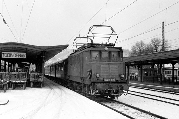 Tübingen, 1 maart 1971. Loc 038 313 en de nauwelijks jongere e-loc 144 037. |