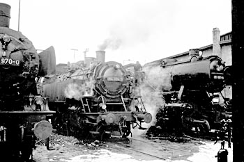 Bw Tübingen, 1 maart 1971. Locs 050 584, 064 094 en 038 382 bij de loods. Op de tweede foto locs 038 970, 064 094 en 051 681. |