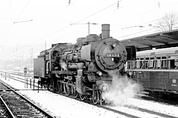 Bw Tübingen, 1 maart 1971. Over de enkelsporige spoorlijn naar Horb passeert 078 410 met een personentrein. Loc 038 382 maakt zich ondertussen op om naar het station van Tübingen te rijden. |
