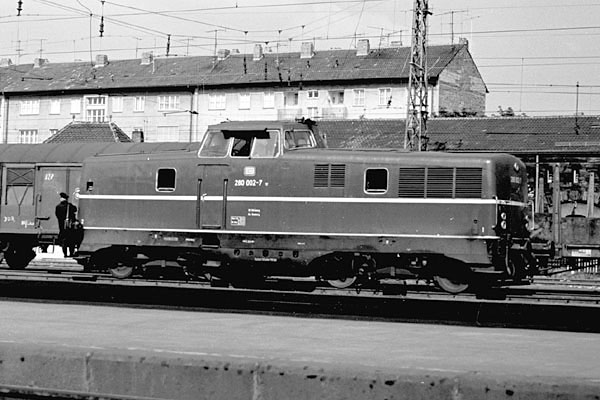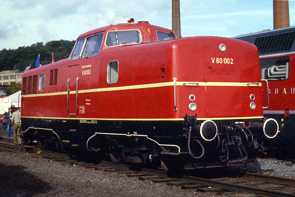 Diesellocs DB V80 (280)De uit 1952 stammende V80 is technisch gezien een halve V200. Het is bij een kleine serie van 10 stuks gebleven, die als voorbeeld heeft gediend voor de V100. De V80 002 is als museumloc bewaard gebleven, maar is bij een grote brand in Nürnberg in oktober 2005 verloren gegaan. De meeste andere locs van de serie zijn naar Italië gegaan en waren daar in 2005 nog aanwezig. Loc V80 001 is inmiddels weer terug in Duitsland. De V80 is gebouwd door MAK. Die heeft in 1954 ook een sterkere zesassige variant gebouwd: loc 2000.001. Deze heeft op proef gereden in Noorwegen en Finland. Deze loc is in 1960 gesloopt. |