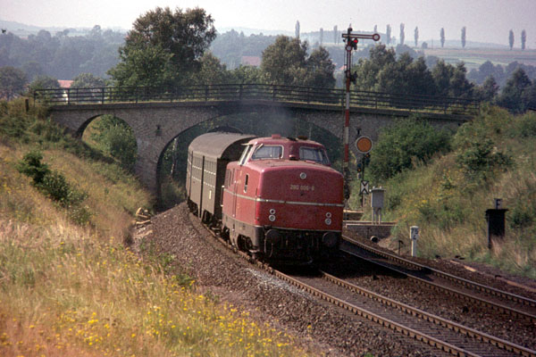 Neuenmarkt-Wirsberg, 3 september 1972. Loc 280 006 gaat met haar lichte reizigerstrein de Schiefe Ebene beklimmen. |
