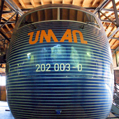 Berlijn, 25 augustus 2009. Draaistroomdiesellocomotief 202 003 in het Deutsches Technikmuseum. Dit is een van de drie proeflocomotieven (type P2500) die Henschel-BBC in 1971-1973 heeft gebouwd om ervaring op te doen met draaistroomtractie. Met locomotief 202 003 zijn ook snelheidsproeven gedaan; deze loc kreeg toen aan één zijde een aerodynamische kop met ramen van de E03. De letters UmAn op de neus geven aan dat de draaistellen een "umkoppelbarer Antriebsmasse" hebben. Loc 202 002 is omgebouwd op 1500 volt gelijkspanning en heeft onder nummer 1600P proefgereden in Nederland; deze loc staat nu voor de fabriek van Bombardier in Kassel. Loc 202 004 staat in het Technomuseum in Mannheim. Loc 202 001 was de voorganger van deze serie (P2000 uit 1962); deze is in 1978 gesloopt. |