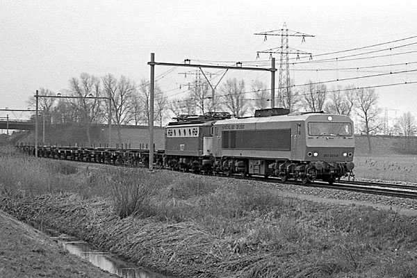 Loenersloot, 8 februari 1980. Ook met loc 202 003 zijn proefritten gereden in Nederland. Hier is ze met loc 1127 op weg van Utrecht naar Amsterdam. Op basis van deze loc wilde de NS een serie 6000 laten ontwerpen, maar dit ging vanwege de kosten niet door. In plaats hiervan werd een standaardlocomotief besteld, die bij NS als serie 6400 in dienst kwam. Foto Albert Sas. |