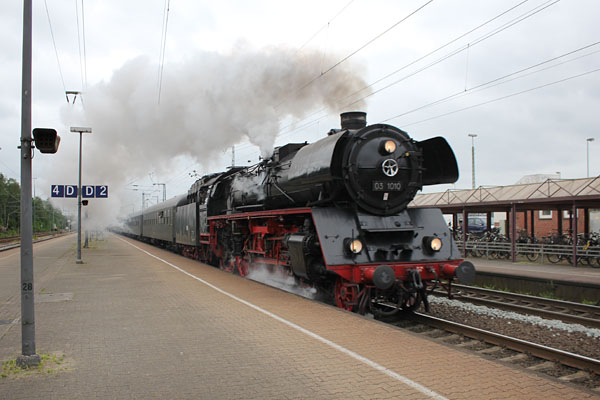 Leer, 9 juni 2012. Loc 03 1010 op weg van Rheine naar Emden, tijdens een rit georganiseerd door Westfalendampf. Achterop de trein liep klassieke e-loc E18 047 mee. Foto René Medendorp. |