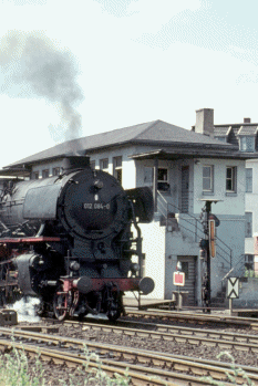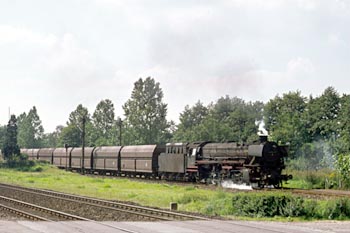 Bij Ihrhove, iets ten zuiden van Leer, takt de lijn uit Nieuweschans aan op de Emslandstrecke. Op 21 augustus 1974 maakte ik hier enkele foto's. Loc 043 196 toont wat ze waard is met een zware ertstrein. Deze locomotief is als monument bewaard gebleven in Salzbergen. Wat later gaat het sein op veilig voor een 042'er met haar trein naar Emden. |