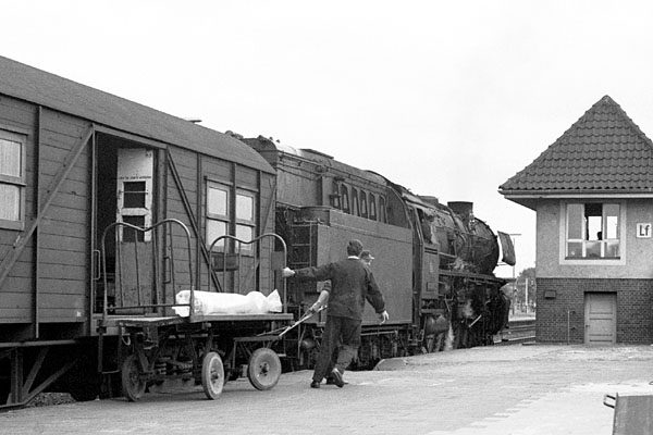Leer, 12 juli 1971. Loc 012 066 met een trein naar Rheine. Snel worden er nog wat spullen uit het houten bagagerijtuig gehaald. |
