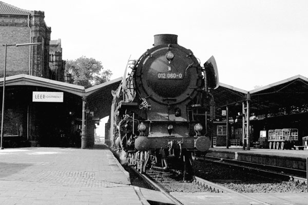 Leer, 13 april 1974. Loc 012 066 is met trein D735 onderweg van Norddeich-Mole naar Rheine. Op het perron staat het bandrecordertje van Rob van der Rest. Foto Jan van Barneveld, collectie Rob van der Rest. |