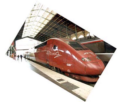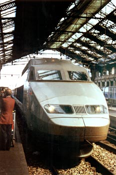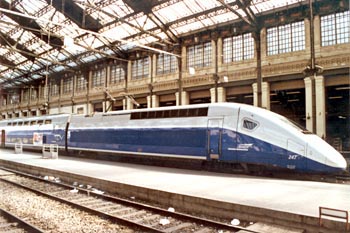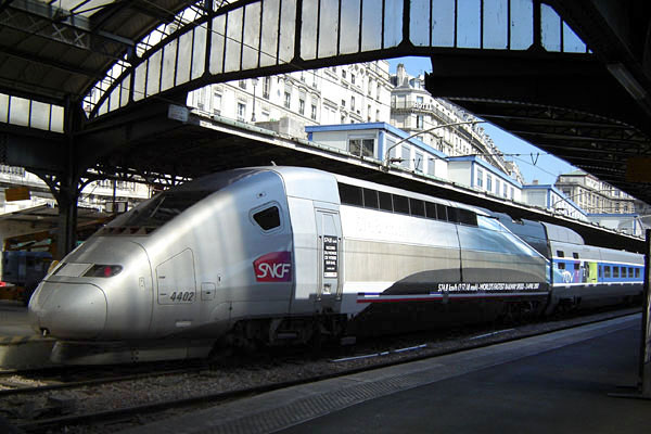 Paris, Gare de l'Est, 15 juli 2008. TGV 4402, waarvan de motorwagens in april 2007 betrokken waren bij het vestigen van het wereldsnelheidsrecord op rails van 574,8 km/uur. Deze trein bestond toen uit twee motorwagens en drie aangepaste Duplex-rijtuigen. Foto Jeffrey Mons. |