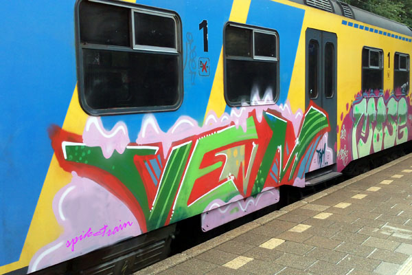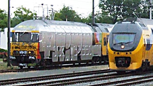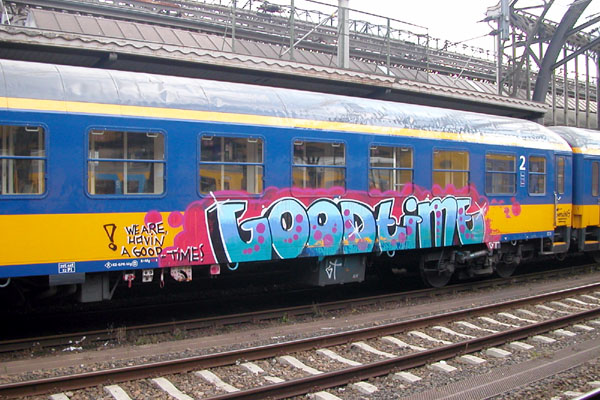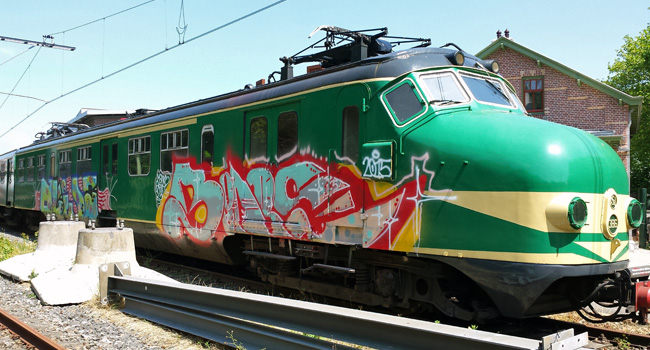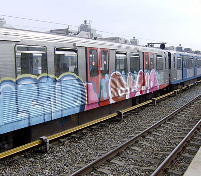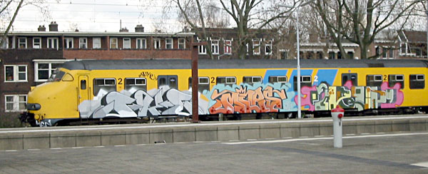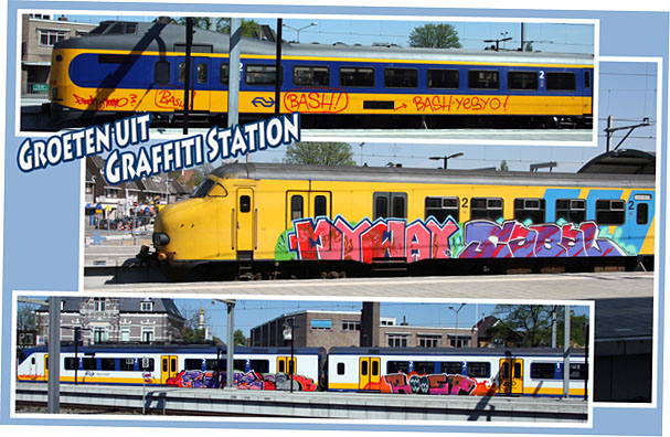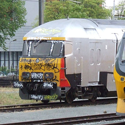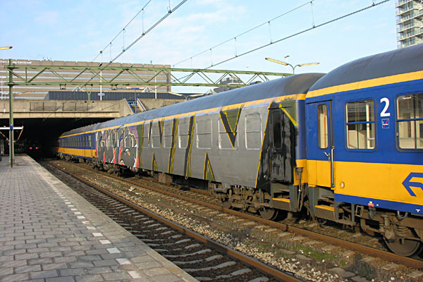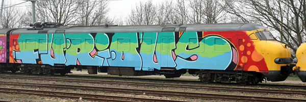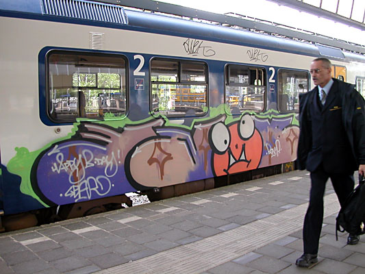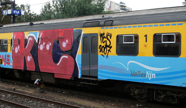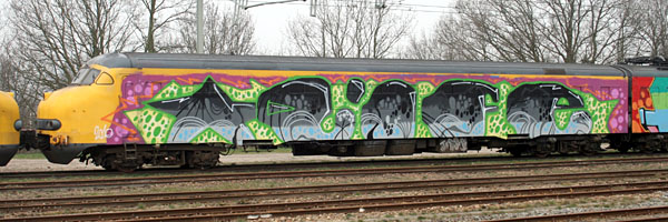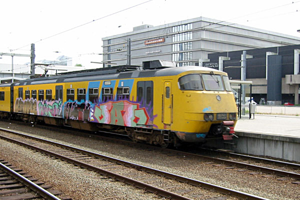 GraffitiVeel sites besteden geen aandacht aan dit onderwerp, omdat het deze vandalen juist te doen zou zijn om publiciteit. Immers: waarom zou je spuitbussen stelen en treinen onderkladderen, als niemand het te zien krijgt? Het beste wapen tegen graffiti is dan ook de betreffende trein niet in dienst nemen maar direct schoonmaken. Dit wapen blijkt steeds minder vaak te worden gehanteerd. Ook het speciale graffititeam van de spoorwegpolitie bestaat voor zover ik weet niet meer. Met enige terughoudendheid laat ik deze foto's zien. Ze zijn gemaakt door mij of door fotografen waarvan ik weet dat het geen "spuiters" zijn. Het onderwerp hoort er nu eenmaal bij, als je het over treinen hebt. Overigens bestaat er ook legale graffiti. |