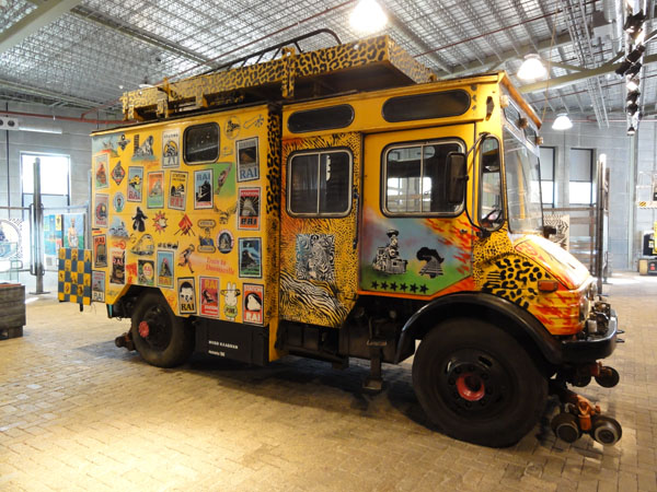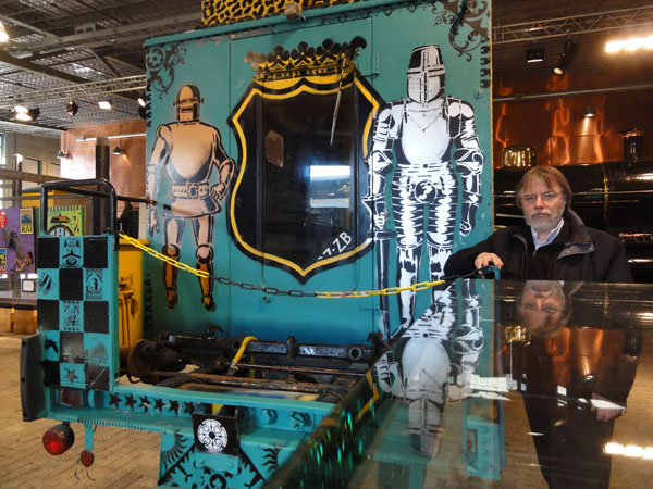 Spoorwegmuseum, 8 april 2012. Hugo Kaagman heeft zich met sjablonen en spuitbussen mogen uitleven op enkele collectiestukken, waaronder een bovenleidingmontagewagen. |