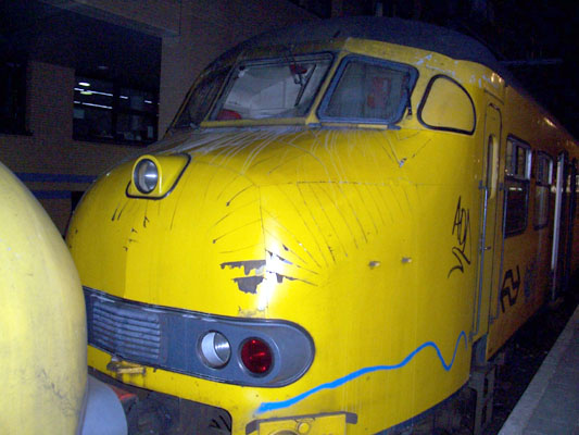 Rotterdam Centraal, 22 mei 2006. Een machinist kijkt misprijzend naar zijn besmeurde Sprinter. |