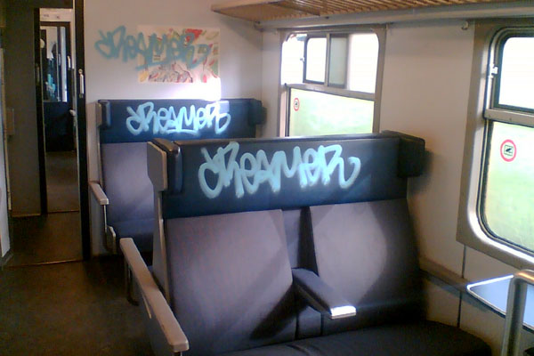 Valleilijn, medio augustus 2007. Dat iemand kans ziet om 's nachts treinen aan de buitenkant te besmeuren, daar kan ik me nog iets bij voorstellen. Maar als een zekere "Dreamer" op zijn gemak het complete interieur van een treinstel kan behandelen, dan moet er wat anders aan de hand zijn. In dit geval gaat het om het ontbreken van toezicht. Connexxion vindt het te duur om conducteurs in te zetten, zodat de jeugd (waaronder veel zogenaamd christelijke scholieren uit Barneveld en Lunteren) onbelemmerd tekeer kan gaan. Oppakken en kaalplukken, lijkt me het devies. Bestaat het speciale graffititeam van de politie eigenlijk nog? Deze foto van treinstel 836 is gemaakt door Benjamin van Waart. |