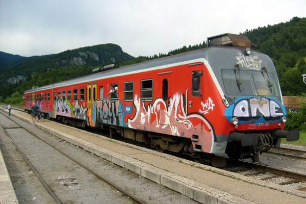 Bohinjska Bistrica, 24 juli 2008. Dieseltreinstel met Sloveense graffiti. Foto Klaas-Jan de Groot. |