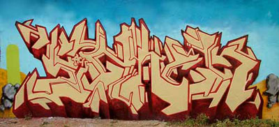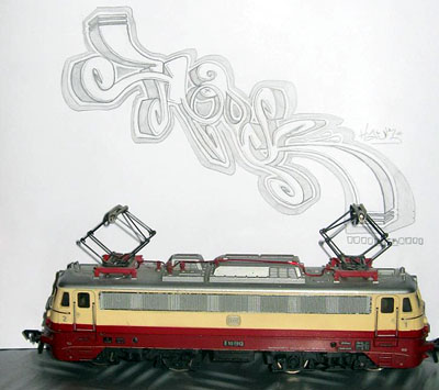 Legale graffiti, op een daarvoor bestemd muurtje bij een skatebaan. In de zomer van 2008 gemaakt door Mees Lauman. Mees bezit modeltreinen van Fleischmann. Ook die worden natuurlijk niet beklad! |