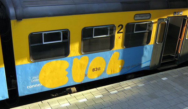 Amersfoort, 1 september 2007. Deze creatieve geest heeft een ander deel van treinstel 838 onder handen genomen. Je zou dit inverse graffiti kunnen noemen: patronen uitsnijden uit op treinen geplakte stickers. Spuiten is zó 2006! En je hoeft er ook geen spuitbussen voor te jatten, alleen maar een Stanleymes. Foto Mark de Koning. |