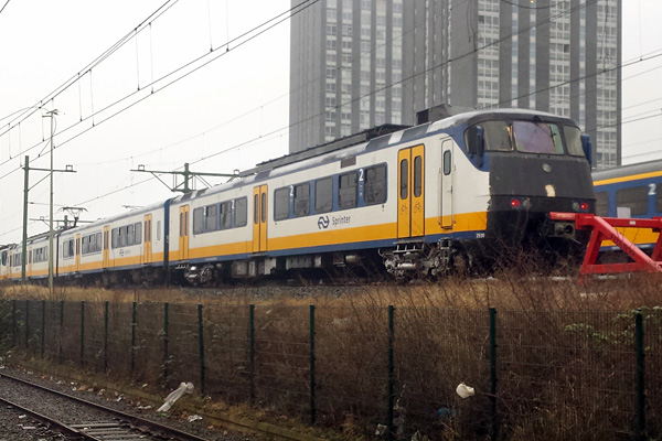Den Haag HS (Parallelweg), 19 februari 2017. Sprinter 2938 heeft een zwarte neus gekregen van een kennelijk in een wat sombere bui verkerende graffitispuiter. Foto Maarten van Mierlo. |