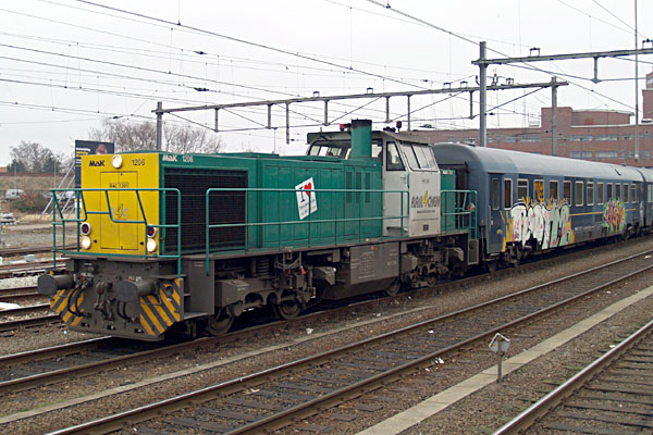 Amersfoort, 4 februari 2006. Loc van Rail4Chem rangeert met rijtuigen. De sticker op de loc vind ik eigenlijk ook al te ver gaan... Foto Remco van den Bosch. |
