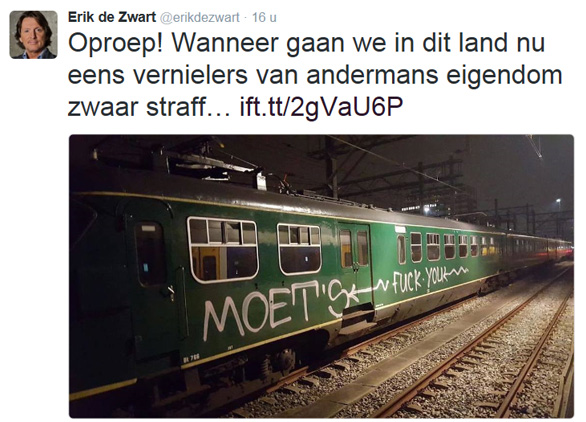 Bron: www.rtlnieuws.nl, 17 februari 2014 Treinengek Erik de Zwart witheet om bekladde wagonsDood- en doodziek zijn ze ervan. Jarenlang hebben tientallen vrijwilligers ontzettend hard gewerkt om hun 'hondekop', een klassieke trein, helemaal op te knappen en nu is hun werk in één klap tenietgedaan door 'spuitbusterroristen'. Erik de Zwart, vooral bekend als radiomaker maar ook treinengek bij uitstek, is woedend op de graffitikunstenaars die afgelopen weekend hun slag sloegen op een terrein van ProRail in Amsterdam. Daar zagen zij tussen alle andere treinen de bijzondere 'hondekop' staan. Ze spoten de groene trein flink onder en vertrokken als dieven in de nacht na het achterlaten van hun 'tag'. De Zwart, die spreekt namens de Stichting Hondekop die de trein in eigendom heeft, is witheet. "Dit is het werk van rapaille dat het eigen plasje wil afzetten. Het heeft niks, maar dan ook niks, met kunst te maken. Maar de mensen die deze trein besmeuren, vernielen wel de kunst van een ander." (...) "Wat mij betreft komt de Tweede Kamer terug van reces en worden ze eindelijk eens aangepakt. Dankzij die tags is heel makkelijk te achterhalen wie dit doet, maar er gebeurt nooit iets mee. Dat terwijl dit gekladder met graffiti de samenleving jaarlijks miljoenen euro's kost." Bron: RTVNH, 29 juli 2016 Erik de Zwart: "Wanneer gaan we vernielers nu eens zwaar straffen?"Amsterdam, 19 december 2016. Hondekop 766 is weer eens onderhanden genomen. Erik de Zwart reageert via Twitter: