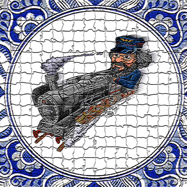 Bulleid Pacific met vastgebonden vrouw, gedacht in Delfts blauw. |