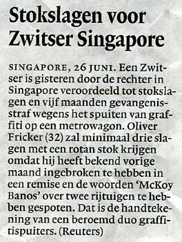 NRC Handelsblad, 26 juni 2010. Stokslagen voor graffitispuiter; in Singapore zijn ze niet vies van pittige straffen. Stokslagen worden uitgedeeld door een geoefende karateka, dus die komen flink aan. Wel is er een arts die toezicht houdt. Foto rechts: Amsterdamse metro, 18 maart 2010. Ja, ik fotografeer graffiti en ik ben niet per se tegen stokslagen. |