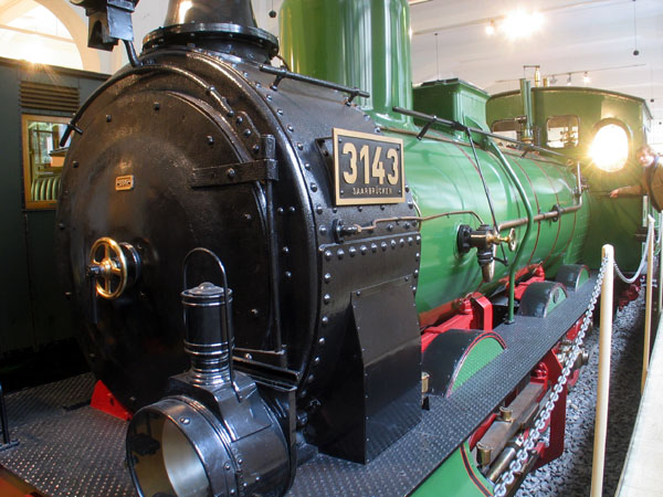 Verkehrsmuseum Nürnberg, 16 augustus 2005. Loc "Saarbrücken 3143", een Pruisische G3, in 1884 gebouwd door Hanomag, fabrieksnummer 1759. In 1911 ging de loc uit dienst en ging toen naar AW Trier voor het testen van hijskranen. |