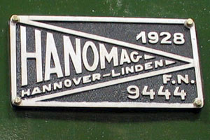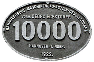 Fabrieksplaten van de 10.000ste Hanomag-loc (zie hierboven) en van het locje hieronder. Wie naar de jaartallen kijkt, ziet dat er met fabrieksnummer 10.000 duidelijk wat is gesjoemeld. |