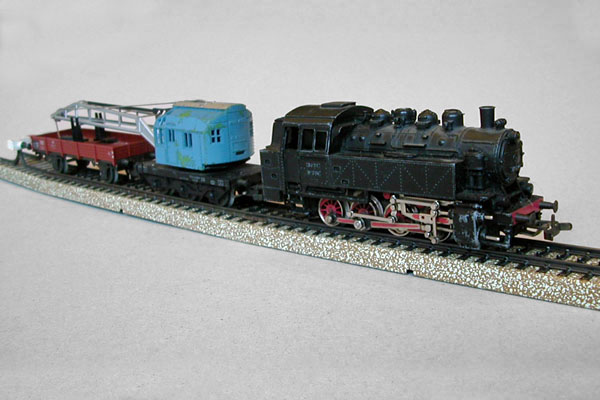 Tenderloc DB 81 004 van Märklin. De Baureihe 81 is door Hanomag gebouwd vanaf 1928. Het is een vierassige variant van de Baureihe 80. Ze waren bestemd voor de zware rangeerdienst. Er zijn er 10 van gebouwd. In 1940 was het plan om er nog 60 te bouwen, maar daar is vanwege de oorlog niets van terecht gekomen. De laatste locs deden dienst in 1963. Loc 81 004 is bewaard gebleven (laatst bekende locatie Naumberg, www.hessencourrier.de). Loc 81 004 van Märklin heeft op afstand bedienbare koppelingen (Telex). De kraan en het platte wagentje heb ik zelf in elkaar gezet. Dit treintje bezit ik sinds omstreeks 1966. |