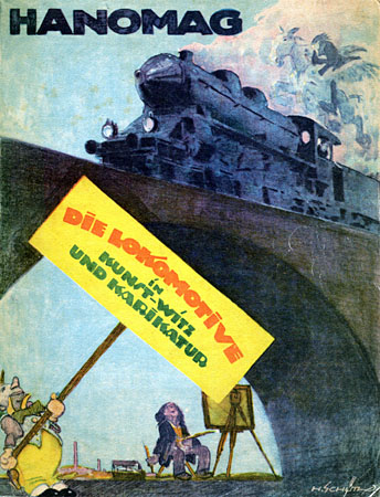 Hanomag Nachrichten. Heft 133. Tijdschrift uit november 1924. Onder andere een technisch artikel over houtgestookte stoomlocomotieven, zoals die bijvoorbeeld op Java werden gebruikt. Die Lokomotive in Kunst, Witz und Karikatur. Uitgegeven door Hanomag in 1922, ter gelegenheid van het opleveren van de locomotief met fabrieksnummer 10.000 (wat niet per se overeenkomt met de 10.000e gebouwde locomotief). |