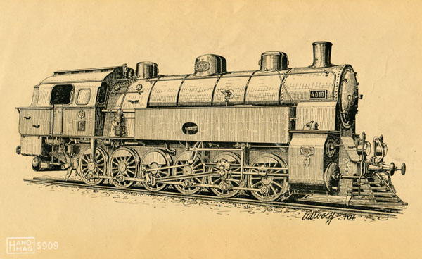Tenderlocomotief 4010 van de Bulgaarse staatsspoorwegen (BDŽ), een compoundlocomotief met zes drijfassen. Dit was de 10.000ste door Hanomag gebouwde locomotief, afgeleverd op 15 juli 1922. De serie bestond uit tien exemplaren. Na 1945 zijn de locs omgebouwd op enkelvoudige expansie. Pentekening van Dipl.-Ing. Ad. Wolff in "Die Lokomotive in Kunst, Witz und Karikatur". Hanomag, 1922. |