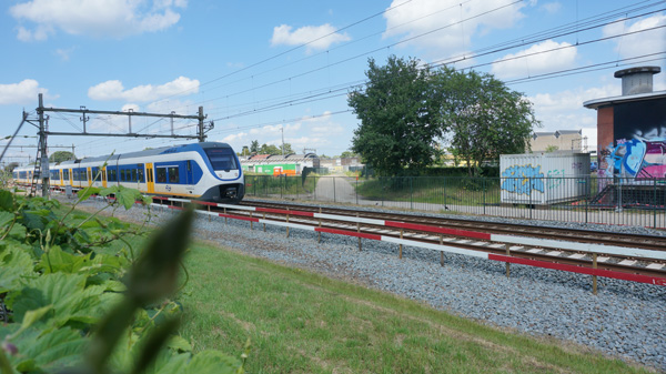 Hilversum, 14 juni 2019. Deze trein is op weg van Hilversum naar Utrecht en nadert station Sportpark. De trein rijdt op de plek waar de busbaan het spoor zal kruisen. De bussen rijden daarna verder langs de spoorlijn naar Amersfoort, te zien in de achtergrond. Rechts het onderstation van Hilversum. Foto Nico Spilt. |