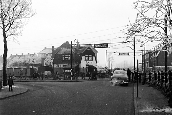 De overweg gezien vanaf de andere kant, in de winter 1958/59. De overwegwachter woonde in woning 32. De straat links is de Mussenstraat. De fotograaf stond met zijn rug naar de Veneta. Foto Streekarchief Gooi- en Vechtstreek, collectie George Seppen. Zie ook Hilversum in vroeger tijden, deel 10. |