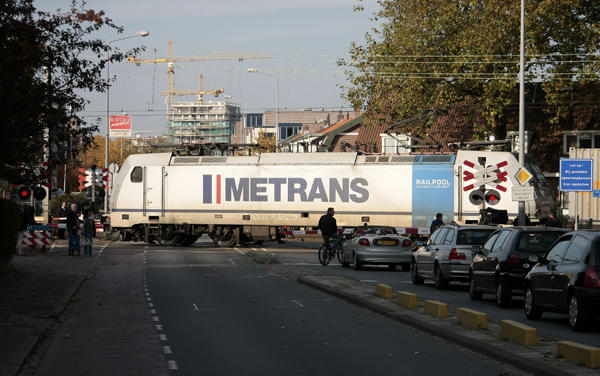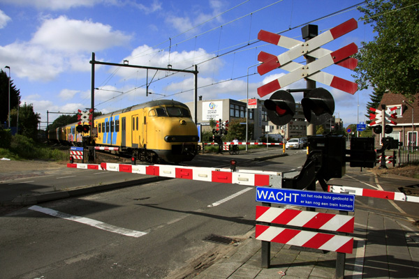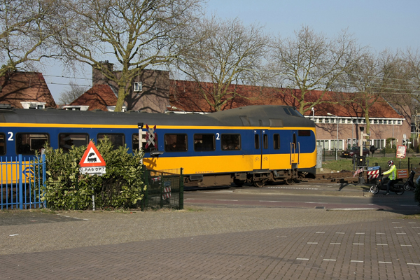 Hilversum, 26 september 2010. De overweg in de Oosterengweg. De trein is op weg naar Baarn en Amersfoort. Op de plaats van de gebouwen in het midden stond lang geleden de tapijtfabriek Veneta. Foto Henk Koster. |