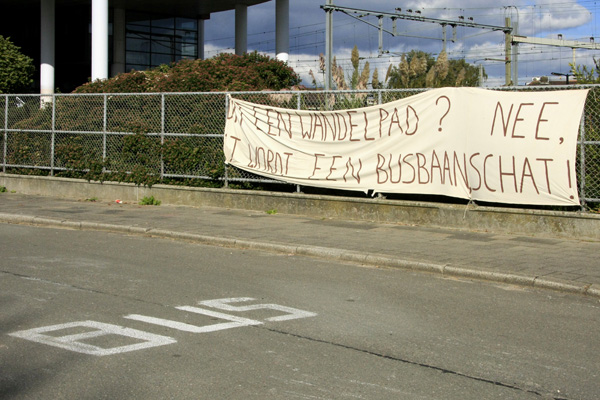 Hilversum, 17 oktober 2010. "Dit een wandelpad? Nee 't wordt een busbaan schat!" Het Wandelpad is een rustig weggetje tussen station Hilversum en station Sportpark. Dat wilden de buurtbewoners graag zo houden, maar hun protesten zijn vergeefs gebleken. Foto's Henk Koster. |