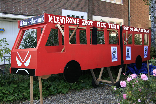 Hilversum, 17 oktober 2010. Deze bus van multiplex is gemaakt door buurtbewoners en is gebruikt bij de protesten tegen de busbaan. De wijk waar de busbaan langskomt heet in de volksmond "Klein Rome". Deze bijnaam is te danken aan de nabijheid van de rooms-katholieke St. Vituskerk. Foto Henk Koster. |