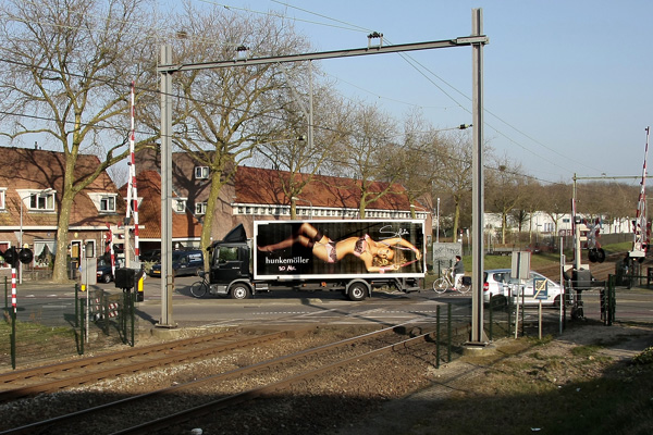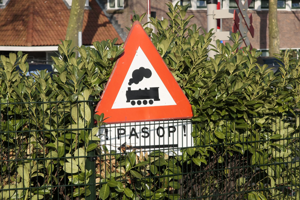 Hilversum, 11 maart 2014. Bij de uitrit van een kantoorgebouw heeft jarenlang een klassiek verkeersbord gestaan om het verkeer te waarschuwen voor de overweg. Foto's Henk Koster. |