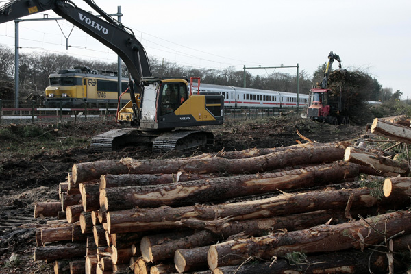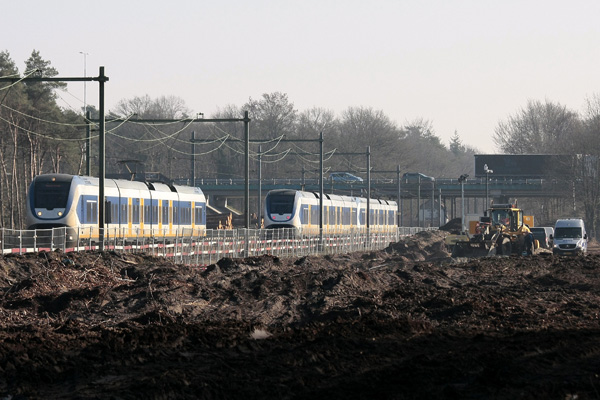 Hilversum, 10 december 2019. Bomen worden gekapt bij het natuur- en recreatiegebied Anna's Hoeve. Zo ontstaat een weg die wordt gebruikt voor de aanvoer van machines, bouwvoertuigen en materialen die nodig zijn voor de bouw van de fly-over van busbaan en faunapassage. Later wordt over deze zandweg een normale verkeersweg aangelegd. Deze gaat dan de weg over Anna’s Hoeve vervangen, die weer teruggegeven wordt aan de natuur. De busbaan komt aan de andere kant van de spoorlijn. De trein komt uit de richting Hilversum. Foto Henk Koster. |