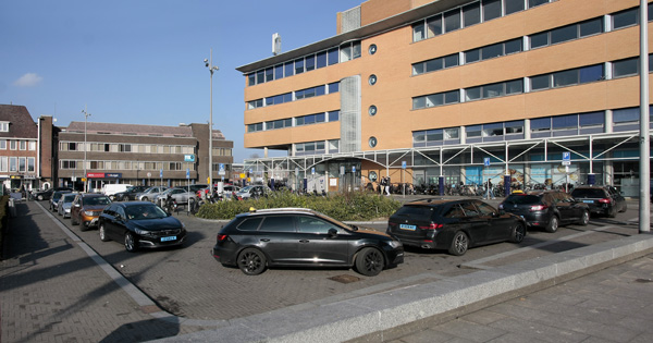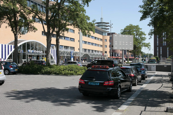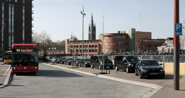 Toen (februari) en nu (april 2026): de oude en de nieuwe taxistandplaatsen. De taxi’s hebben een nieuwe, definitieve standplaats gekregen naast het nieuwe busstation. Ook de fietsenstalling, de Kiss&Ride en de gehandicaptenparkeerplaatsen zijn in verband met de bouwplannen (tijdelijk) verplaatst naar de plek waar het tijdelijke busstation gestaan heeft.