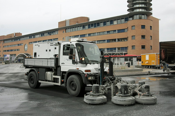 Hilversum, 29 oktober 2025. Deze Unimog is uitgerust met vijf schuurkoppen. Daarmee wordt de deklaag van de busbaan opgeruwd. Dit zorgt voor een betere grip op het wegdek. Dat is noodzakelijk voor de veiligheid op het busstation. De machine gebruikt daarbij diamant als schuurmiddel. Een Unimog is een universeel werkvoertuig dat ontwikkeld is om diverse specialistische werkzaamheden uit te voeren, bijvoorbeeld op en rond het spoor. Unimogs worden vaak voorzien van spoorgeleidewielen. In deze uitvoering is het een railwegvoertuig dat op rails kan rijden en ingezet kan worden bij incidentenbestrijding. Een Unimog is in staat om gestrande treinstellen af te voeren.