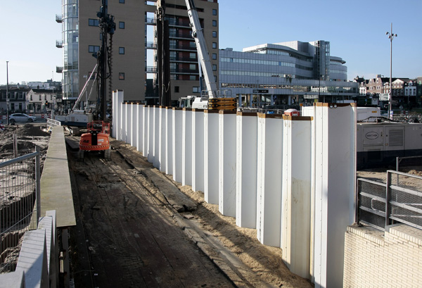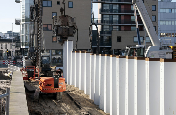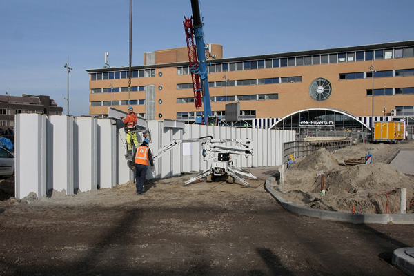 Hilversum, 4 februari 2026. Eerst worden stalen damwanden ingedrukt. Die gaan niet volledig de grond in. Het gedeelte dat daarboven uitsteekt dient als nieuwe tunnelwand en is van tevoren voorzien van een lichtgrijze coating.