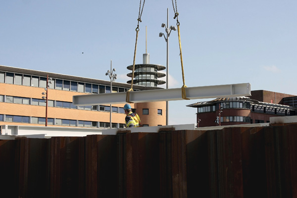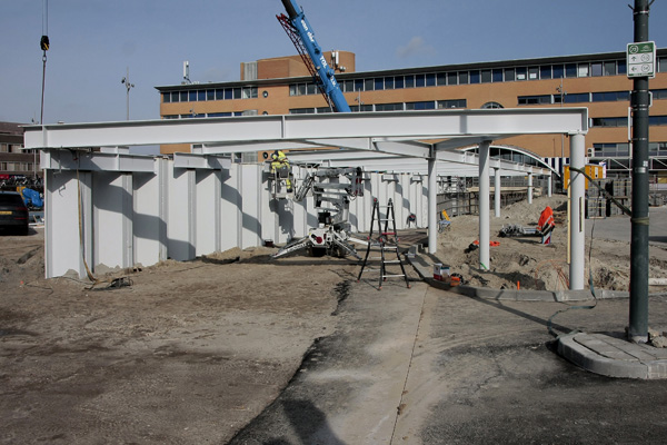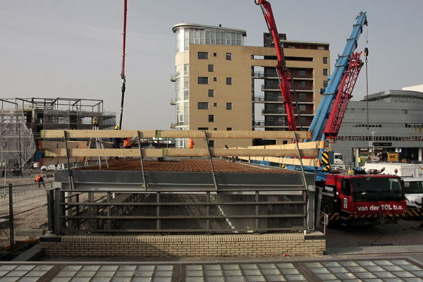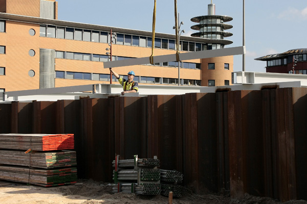 Hilversum, 18-26 februari 2026. Dit zijn de stalen onderdelen waarmee de constructie van de overkapping wordt opgebouwd. Een mobiele kraan brengt elk onderdeel naar de juiste plek. Bepaalde onderdelen worden aan de damwanden gelast, terwijl andere delen aan elkaar worden geschroefd.