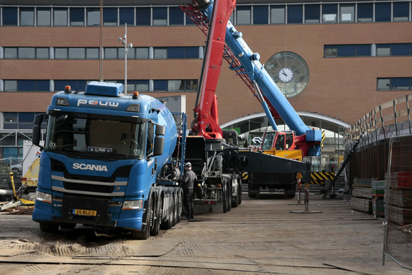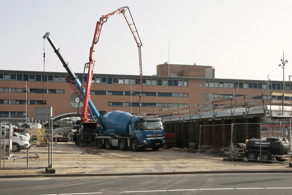Hilversum, 6 maart 2026. Nadat de staalconstructie in elkaar is gezet, wordt er een laag beton gestort op het dak. Betonmixers storten het materiaal in een betonpomp, waarna het via de giek over het dak verdeeld wordt.