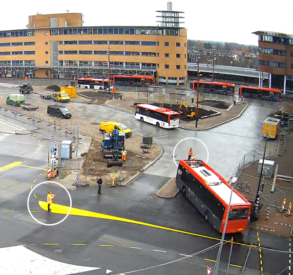 Hilversum, 24 november 2025 (webcam). Klopt het allemaal wel wat er met de computer bedacht is? Kennelijk is men er niet zeker van of de bocht bij de entree van het busstation zonder problemen gehaald kan worden. Om daar achter te komen worden er door medewerkers van Transdev testen uitgevoerd met bussen van verschillende lengte. De bevindingen hebben aangetoond dat de bocht inderdaad aangepast moet worden.