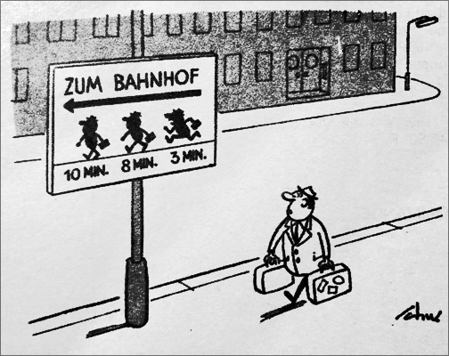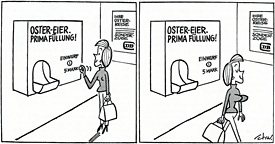 Boven: cartoon uit La vie du rail, 1970 Rechts: Mal Ernst. Mal Heiter. Duitse humor, aangeboden door Hans Glaser (Pressechef der DB) en Rudolf Schwarz. Redactor Verlag, 1972. ISBN 3876660084. Paaseieren, prima vulling! |